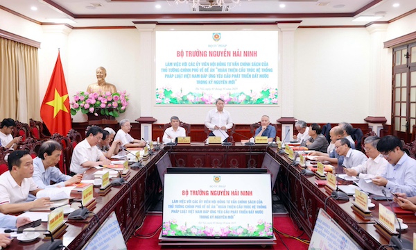 Chiều 3/10, Bộ trưởng Bộ Tư pháp Nguyễn Hải Ninh chủ trì cuộc làm việc với các Ủy viên Hội đồng tư vấn chính sách của Thủ tướng Chính phủ về Đề án “Hoàn thiện cấu trúc hệ thống pháp luật Việt Nam đáp ứng yêu cầu phát triển đất nước trong kỷ nguyên mới. Cùng dự có Thứ trưởng Bộ Tư pháp Nguyễn Thanh Tú; Phó Bí thư chuyên trách Đảng ủy Bộ Nguyễn Quang Thái.