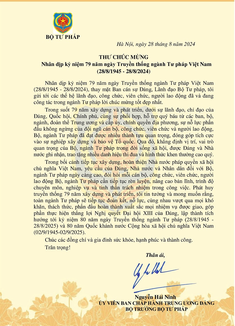 Thư của Bộ trưởng Bộ Tư pháp Nguyễn Hải Ninh gửi các thế hệ lãnh đạo, công chức, viên chức, người lao động đã và đang công tác trong ngành Tư pháp nhân dịp kỷ niệm 79 năm ngày Truyền thống ngành Tư pháp Việt Nam (28/8/1945 - 28/8/2024).